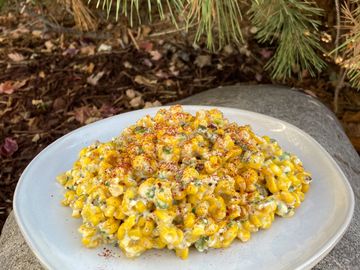 The easiest description would be Mexican Street Corn (Elote) with a twist or two and served off the cob so it is easier to eat.