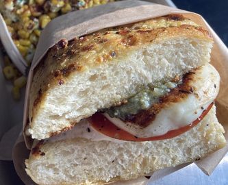 Toasted Potato Rosemary Roll with Fresh Mozzarella, Blistered Tomatoes, Garlic Aioli and Pesto.